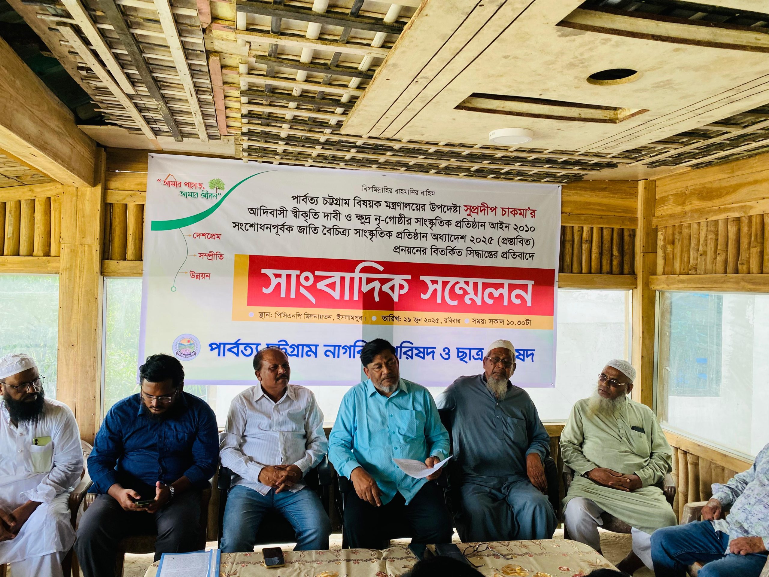 উপদেষ্টা সুপ্রদীপ চাকমা'র আদিবাসী স্বীকৃতি দাবী ও ক্ষুদ্র নৃ-গোষ্ঠীর সাংস্কৃতিক প্রতিষ্ঠান আইন ২০১০ সংশোধনপূর্বক জাতি বৈচিত্র্য সাংস্কৃতিক প্রতিষ্ঠান অধ্যাদেশ ২০২৫ (প্রস্তাবিত) প্রনয়নের বিতর্কিত সিদ্ধান্তের প্রতিবাদে রোবাবর (২৯জুলাই) পিসিএনপি কেন্দ্রীয় নেতৃবৃন্দ বান্দরবান জেলা কর্যালয় মুসাফির পার্কে এক সংবাদ সম্মেলন করেন।