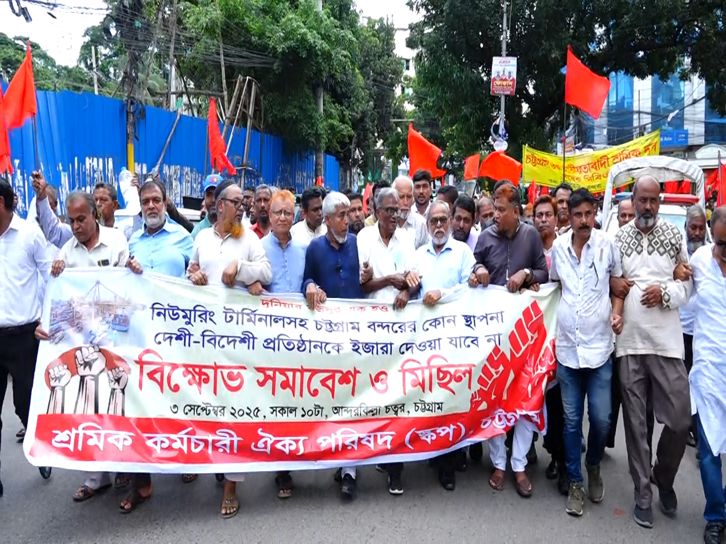 নিউমুরিং টার্মিনালসহ চট্টগ্রাম বন্দরের বিভিন্ন স্থাপনা দেশী-বিদেশী প্রতিষ্ঠানকে ইজারা দেওয়ার প্রতিবাদে বিক্ষোভ সমাবেশ ও মিছিল করেছে শ্রমিক কর্মচারী ঐক্য পরিষদ (স্কপ), চট্টগ্রাম।