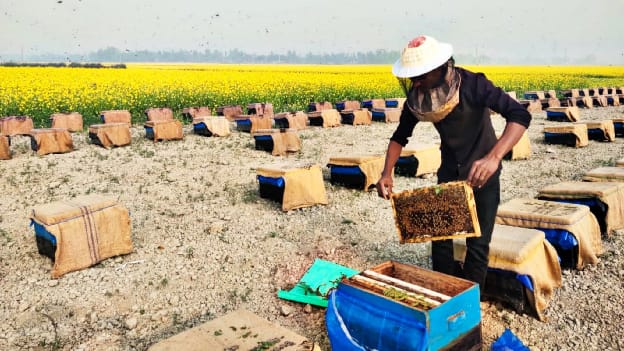 সরিষা ফুলে ভরে উঠেছে সিরাজগঞ্জের উল্লাপাড়া উপজেলার বিস্তীর্ণ মাঠ। শীত মৌসুমের শুরুতেই এসব সরিষা জমিতে স্থাপন করা হয়েছে মৌ চাষীদের মধু সংগ্রহের বাক্স। ফলে পুরো এলাকায় এখন মধু উৎপাদন কে ঘিরে বাড়ছে কর্মচাঞ্চল্য। সরিষা চাষের দিক থেকে দেশের শীর্ষ উপজেলা হওয়ায় প্রতি বছরই উল্লাপাড়া মৌ চাষীদের কাছে অন্যতম গুরুত্বপূর্ণ এলাকায় পরিণত হয়।উপজেলা কৃষি অফিস সূত্রে জানা গেছে, চলতি মৌসুমে উল্লাপাড়ায় ২৪ হাজার ৫৭০ হেক্টর জমিতে সরিষা আবাদ করা হচ্ছে। এ থেকে প্রায় ৪৩ হাজার ৫৮ মেট্রিক টন সরিষা উৎপাদনের লক্ষ্যমাত্রা নির্ধারণ করা হয়েছে। উধুনিয়া, বড় পাঙ্গাসী, লাহিড়ী মোহনপুর, বাঙ্গালা, সলঙ্গা, পূর্ণিমাগাঁতী, কয়ড়া ও দুর্গানগর ইউনিয়নে সবচেয়ে বেশি সরিষা চাষ হয়েছে। সরিষা গাছে ফুল ফোটার সঙ্গে সঙ্গে দেশের বিভিন্ন জেলা থেকে মৌ চাষীরা উল্লাপাড়ায় এসে তাদের মৌ বাক্স বসিয়েছেন। গত এক সপ্তাহে শতাধিক মৌ খামারি উপজেলার বিভিন্ন এলাকায় মধু সংগ্রহের বাক্স স্থাপন করেছেন। বর্তমানে মাঠে ১০ হাজারের বেশি মৌ বাক্স রয়েছে। কৃষি বিভাগের হিসাবে, মৌসুম শেষে এই সংখ্যা প্রায় ১৪ থেকে ১৫ হাজারে পৌঁছাতে পারে। প্রতিটি মৌ বাক্স থেকে গড়ে ১৩ থেকে ১৫ কেজি মধু সংগ্রহ করা সম্ভব। এই হিসাবে চলতি মৌসুমে উল্লাপাড়া উপজেলায় প্রায় দুই লাখ কেজি বা ২০০ মেট্রিক টন মধু উৎপাদনের সম্ভাবনা রয়েছে। এই বিষয়ে একজন স্থানীয় মৌ খামারি মোঃ হারুন অর রশিদ তিনি বলেছেন, আমি প্রাথমিক বিদ্যালয়ের একজন শিক্ষক হয়ে ও আমি কোনো পেশাকে ছোট করে না দেখে শুধু মাত্র তরুণদের উদ্বুদ্ধ করার জন্য নিজস্ব তত্ত্বাবধানে রেখে বেশ কিছু মৌ খামারি কে এই পেশায় নিয়োজিত করার জন্য উৎসাহ দিয়ে যাচ্ছি  এবং শিক্ষিত বেকার তরুণদের মধুর ব্যবসা করতে আগ্রহ তৈরি করে যাচ্ছি। এবং আমি নিজেও আত্মীয় স্বজন ও বন্ধু বান্ধবদের মাঝে সল্প লাভে খাঁটি এবং কোয়ালিটি সম্পন্ন মধু তুলে দিয়েছি। এছাড়াও আমার পরামর্শে বেশ কয়েকজন তরুণ মৌ খামার ও মধু ব্যবসায়ী আমার সাথে যুক্ত হয়েছেন। এই বিষয়ে শিক্ষক মোঃ হারুন অর রশীদ স্যার আরো বলেছেন, আমার তত্ত্বাবধানে যে মৌ খামার গুলো রয়েছে সেগুলো – উধুনিয়া সঞ্চিত মৌ খামার, মনিরুল মৌ খামার, সুজন মৌ খামার, জহুরুল মৌ খামার এছাড়াও ঘোলারিয়া গ্রামে রয়েছে মিনারুল মৌ খামার। তাদের সকলের সাথে কথা বলে জানতে চাইলে তারা জানিয়েছেন প্রথম দিকে ৫-৬ দিনের মধ্যে মধু কালেকশন করলেও হারুন অর রশীদ স্যারের পরামর্শে এখন ১০-১২ দিন পরপর মধু কালেকশন করি। এতে করে মধুর গুনগত মান যথেষ্ট ভালো পাওয়া যাচ্ছে এবং মধুর দামও একটু বেশি পাওয়া যাচ্ছে। এদিকে উল্লাপাড়ার লাহিড়ী মোহনপুরে জাইকার অর্থায়নে মধু প্রসেসিং প্ল্যান