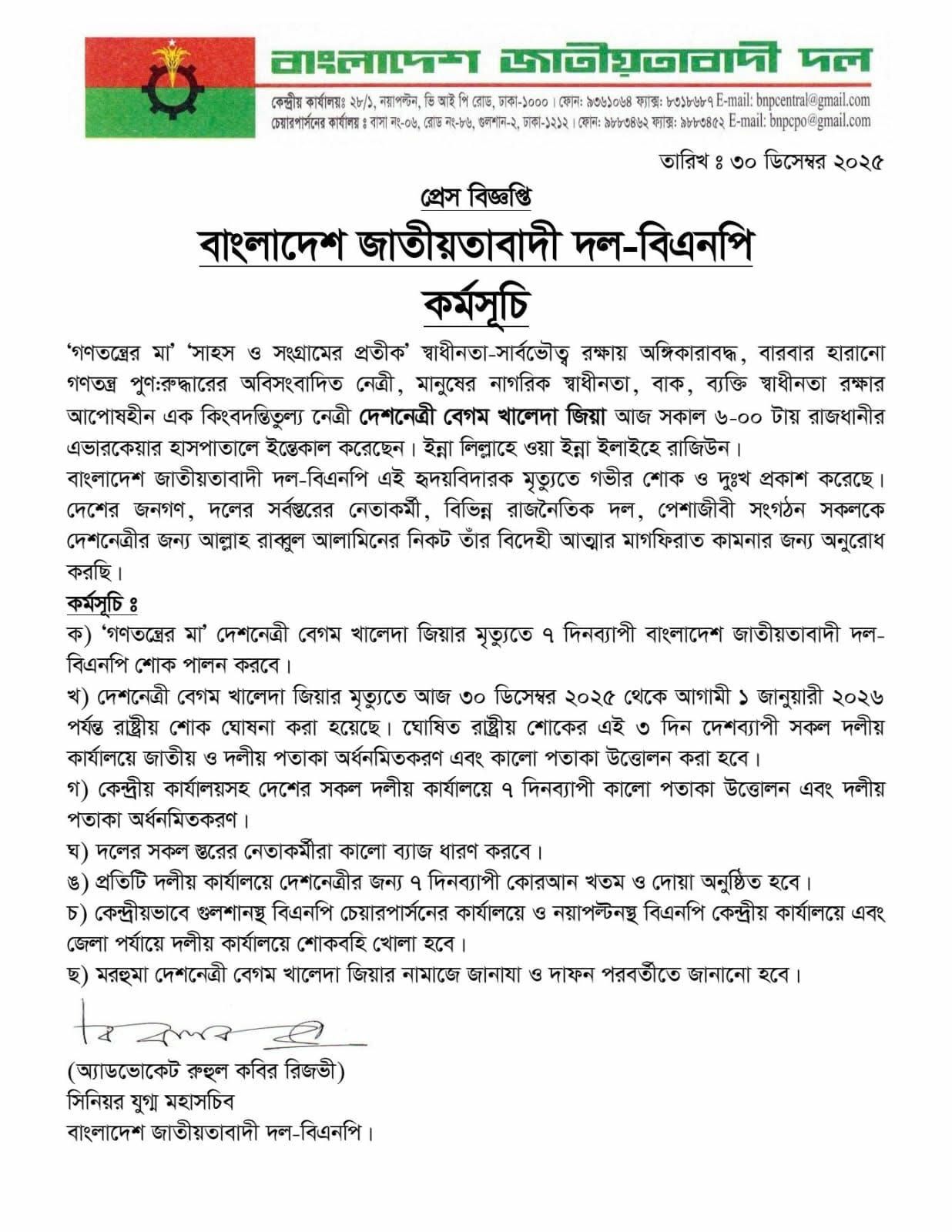 ক) ‘গণতন্ত্রের মা’ দেশনেত্রী বেগম খালেদা জিয়ার মৃত্যুতে বাংলাদেশ জাতীয়তাবাদী দল–বিএনপি ৭ (সাত) দিনব্যাপী শোক পালন করবে। খ) দেশনেত্রী বেগম খালেদা জিয়ার মৃত্যুতে আজ ৩০ ডিসেম্বর ২০২৫ থেকে আগামী ১ জানুয়ারি ২০২৬ পর্যন্ত ৩ (তিন) দিনের রাষ্ট্রীয় শোক ঘোষণা করা হয়েছে। ঘোষিত রাষ্ট্রীয় শোকের সময়ে দেশব্যাপী সকল দলীয় কার্যালয়ে জাতীয় ও দলীয় পতাকা অর্ধনমিত রাখা হবে এবং কালো পতাকা উত্তোলন করা হবে। গ) কেন্দ্রীয় কার্যালয়সহ দেশের সকল দলীয় কার্যালয়ে ৭ দিনব্যাপী কালো পতাকা উত্তোলন এবং দলীয় পতাকা অর্ধনমিত রাখা হবে। ঘ) দলের সকল স্তরের নেতাকর্মীরা কালো ব্যাজ ধারণ করবেন। ঙ) প্রতিটি দলীয় কার্যালয়ে দেশনেত্রীর জন্য ৭ দিনব্যাপী কোরআন খতম ও দোয়া মাহফিল অনুষ্ঠিত হবে। চ) কেন্দ্রীয়ভাবে গুলশানস্থ বিএনপি চেয়ারপারসনের কার্যালয় ও নয়াপল্টনস্থ বিএনপি কেন্দ্রীয় কার্যালয়সহ জেলা পর্যায়ের দলীয় কার্যালয়গুলোতে শোকবহি খোলা হবে। ছ) মরহুমা দেশনেত্রী বেগম খালেদা জিয়ার নামাজে জানাজা ও দাফন সংক্রান্ত সময়সূচি পরবর্তীতে জানানো হবে।