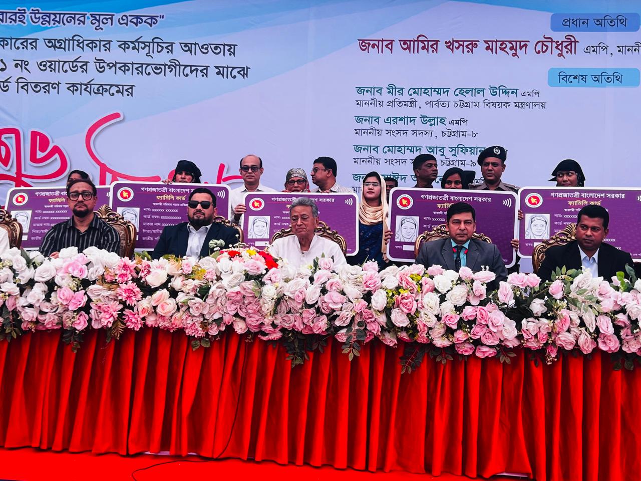 মঙ্গলবার সকালে চট্টগ্রামের পতেঙ্গায় চট্টগ্রাম বিমানবন্দর উচ্চ বিদ্যালয় মাঠে আয়োজিত ফ্যামিলি কার্ড বিতরণ অনুষ্ঠানে প্রধান অতিথির বক্তব্যে তিনি এ কথা বলেন।মন্ত্রী জানান, নগরীর ৪১ নম্বর দক্ষিণ পতেঙ্গা ওয়ার্ডের মোট ৫ হাজার ৫৭৫টি পরিবার ফ্যামিলি কার্ড পাবে। এর মধ্যে মঙ্গলবারের অনুষ্ঠানে ৬৮০ জন উপকারভোগীর হাতে কার্ড তুলে দেওয়া হয়। বাকি উপকারভোগীদের মধ্যে ওয়ার্ড কার্যালয় থেকে পর্যায়ক্রমে কার্ড বিতরণ করা হবে।খানা জরিপের মাধ্যমে ওই ওয়ার্ডে মোট ১০ হাজার ১২৪ জনের তালিকা প্রস্তুত করা হয়। পরে দারিদ্র্য সূচক মান (পিএমটি) স্কোরিং অনুযায়ী যাচাই-বাছাই শেষে ৫ হাজার ৫৭৫ জনকে চূড়ান্তভাবে নির্বাচন করা হয়।নিজের অনুভূতির কথা তুলে ধরে আমির খসরু মাহমুদ চৌধুরী বলেন, “আমার রাজনৈতিক ও কর্মজীবনে অনেক প্রকল্প বাস্তবায়ন করেছি। কিন্তু ফ্যামিলি কার্ড কর্মসূচি আমাকে ভিন্ন ধরনের অনুভূতি দিচ্ছে। এটি আমার রাজনৈতিক জীবনের একটি মাইলফলক হয়ে থাকবে।”